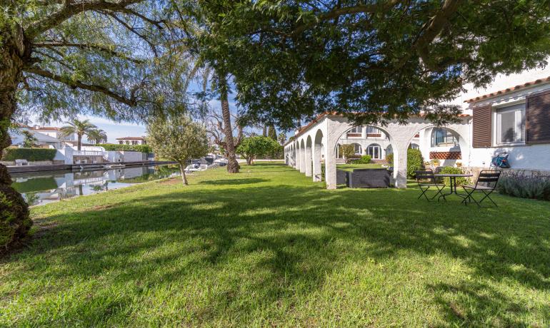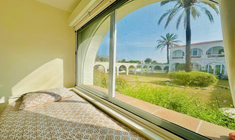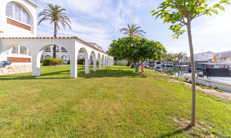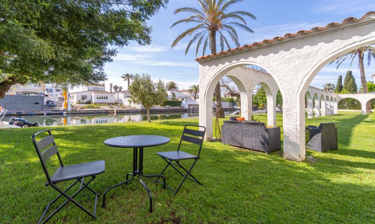It offers a pleasant living-dining area with an open-plan kitchen, creating a comfortable and functional space. From the living room, there is direct access to a charming and very शांत community garden bordering one of the canals of Empuriabrava, providing a unique and relaxing environment. The southwest orientation ensures excellent natural light throughout the day.