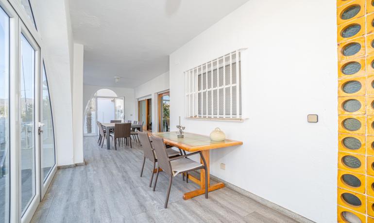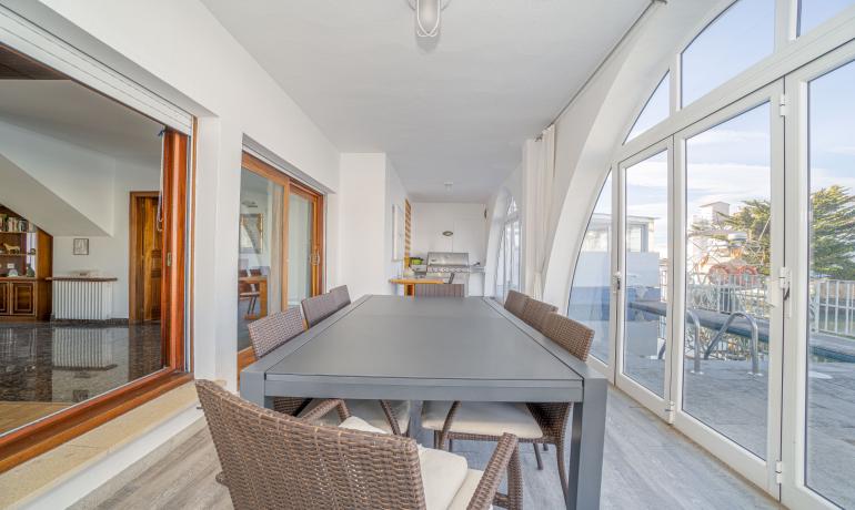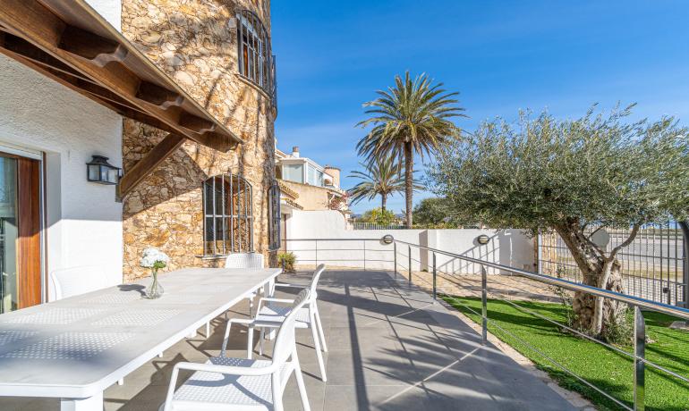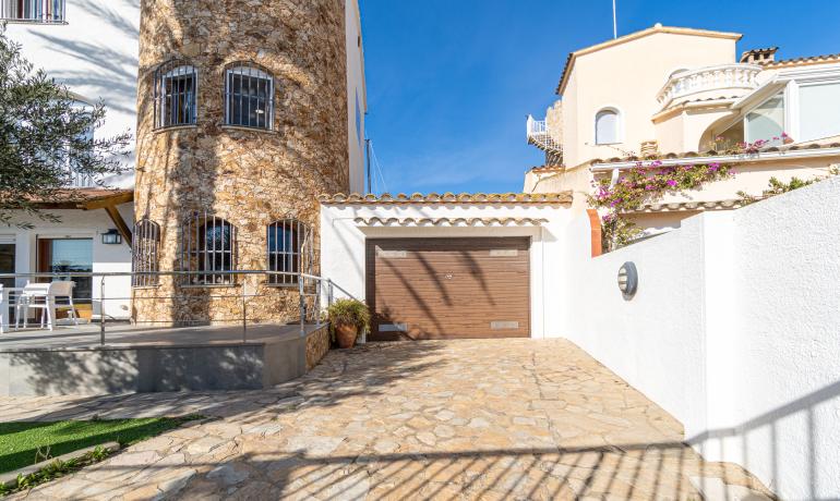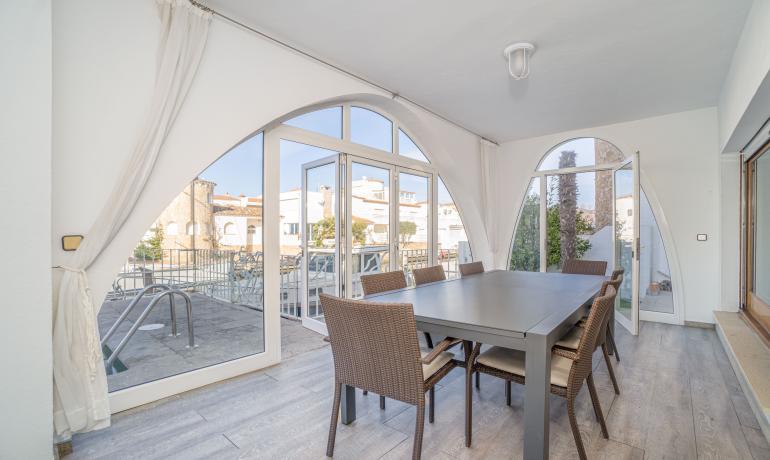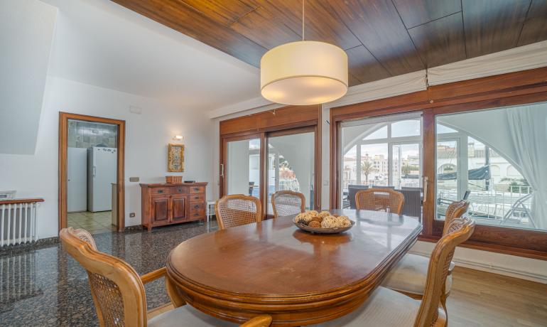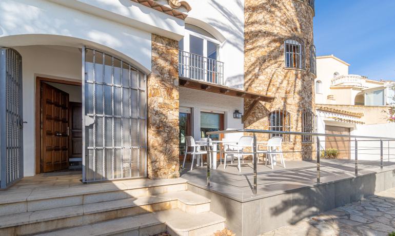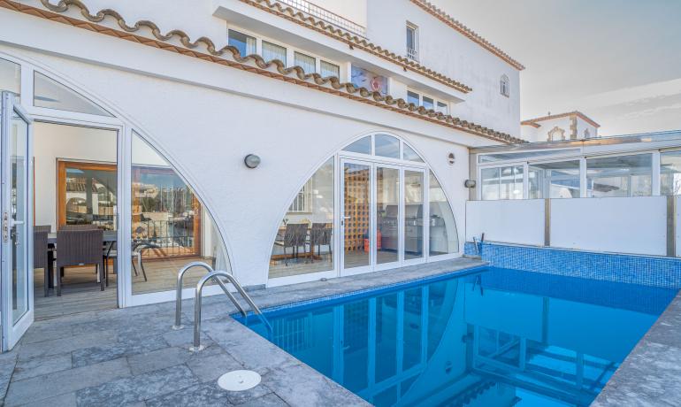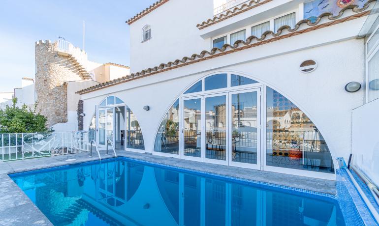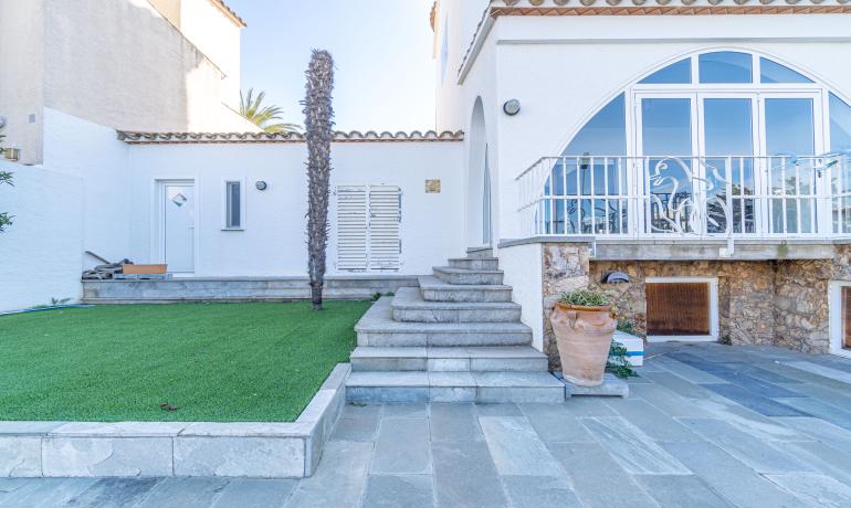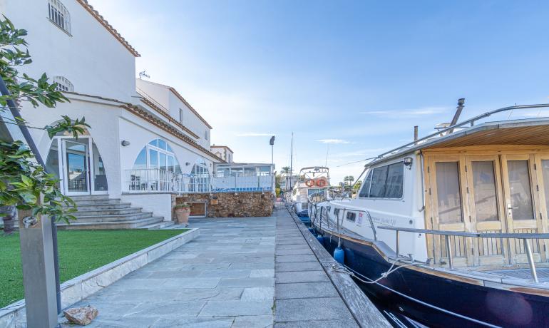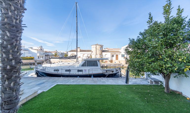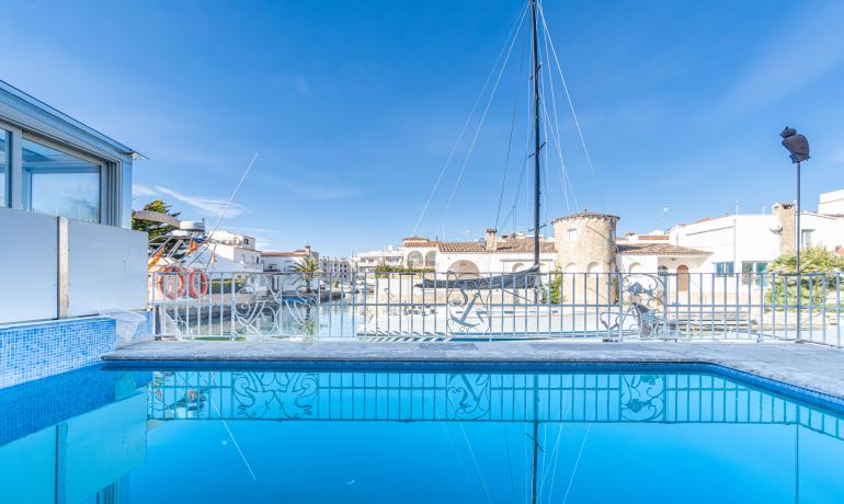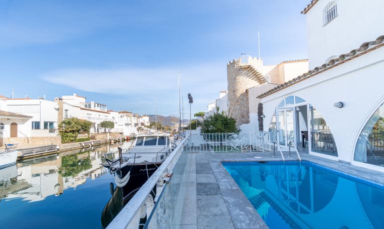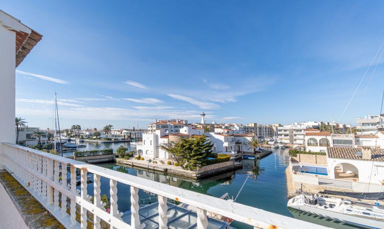 Magnifica casa amb vistes a la badia de Roses, a només uns passos de la platja la Rubina, a Empuriabrava. Té un amarratge de 16 metres ubicat abans dels ponts, en un port privat molt tranquil a prop de la sortida al mar.