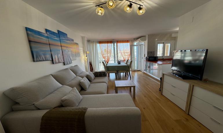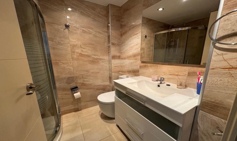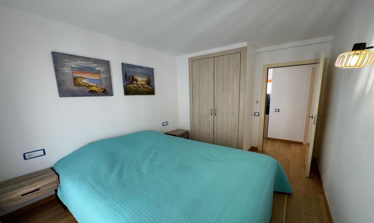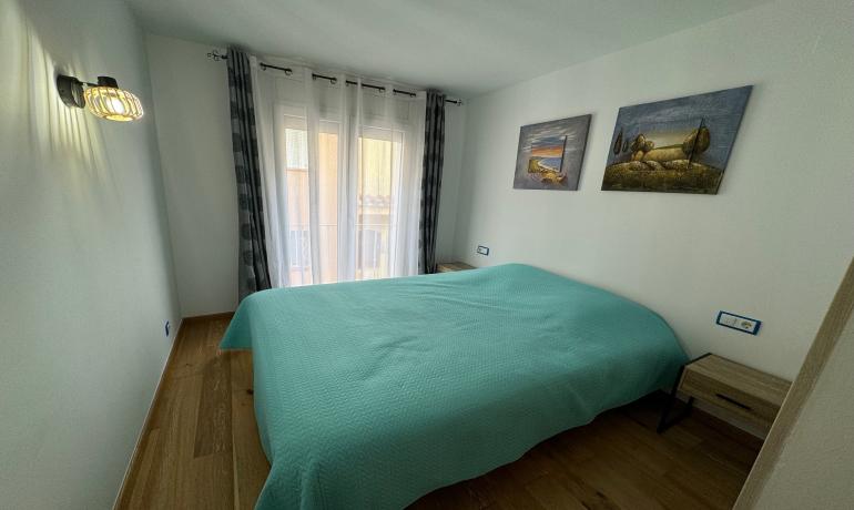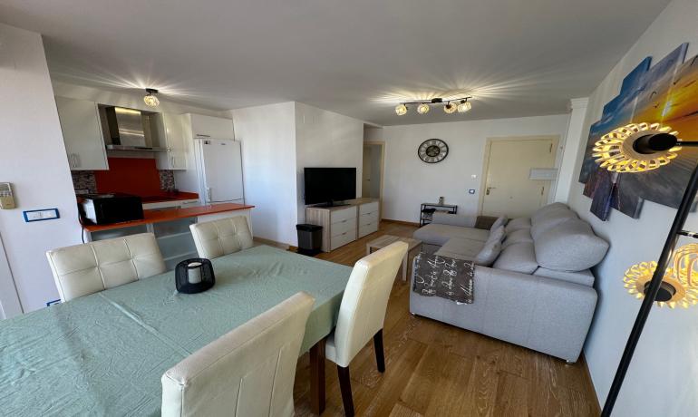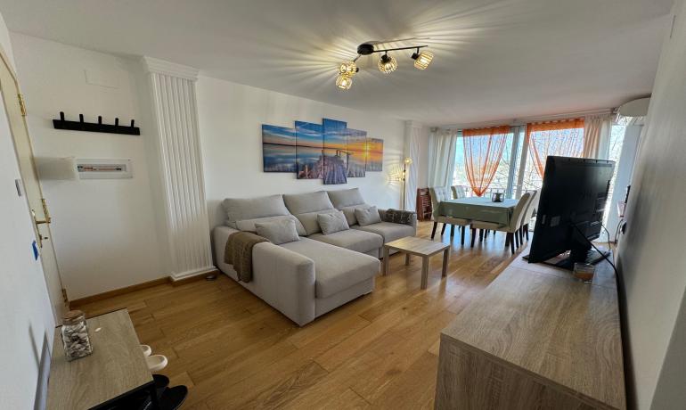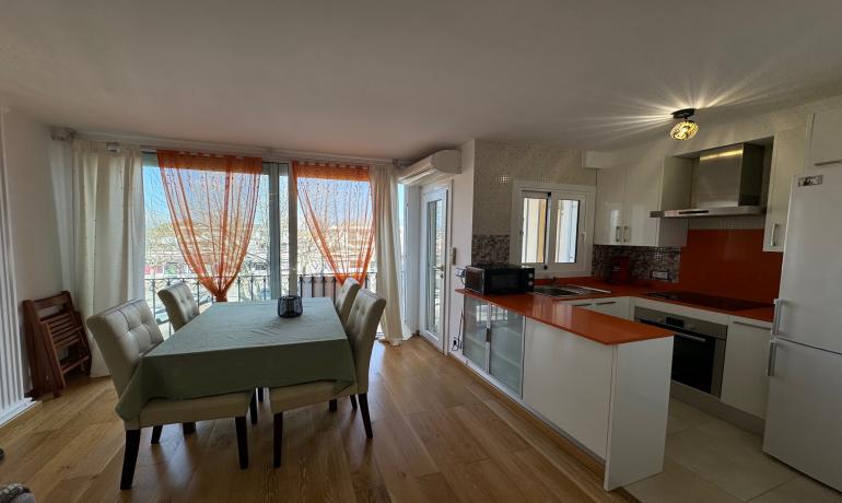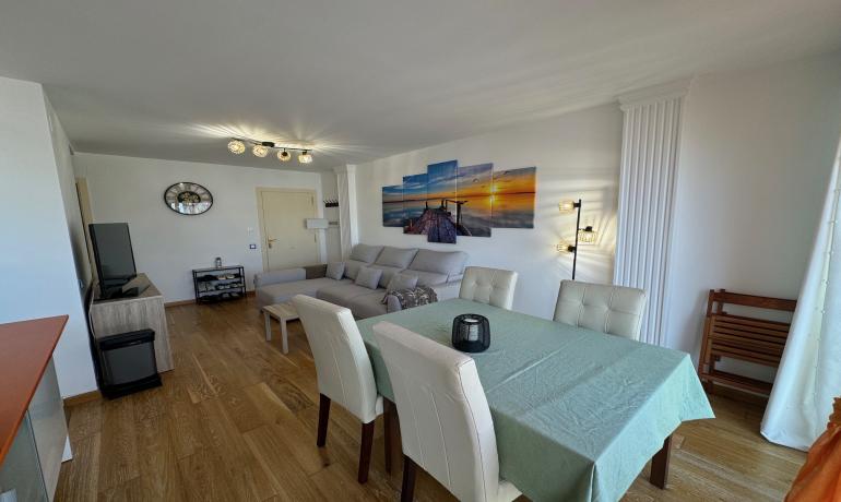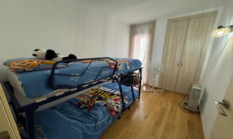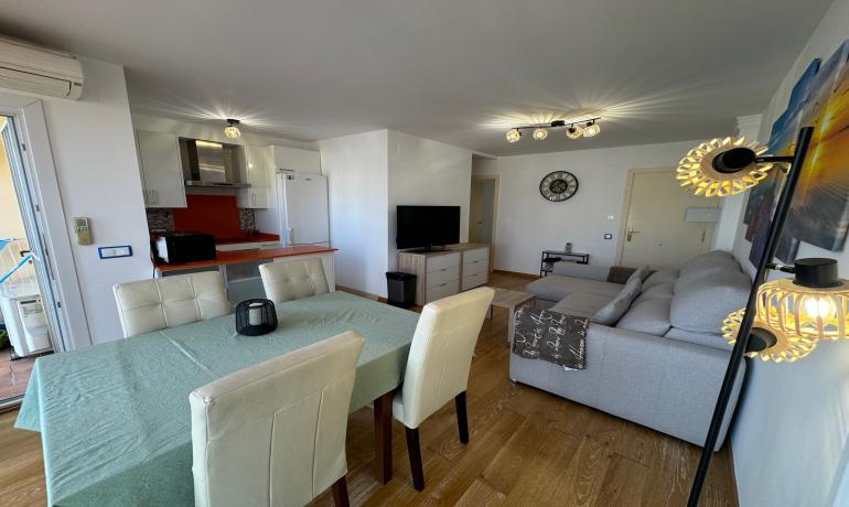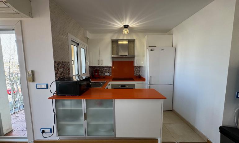 Die Wohnung verfügt über ein helles Wohn-Esszimmer mit einer voll ausgestatteten offenen Küche, einen kleinen Balkon, zwei Schlafzimmer mit Einbauschränken und ein modernes Badezimmer mit Dusche.