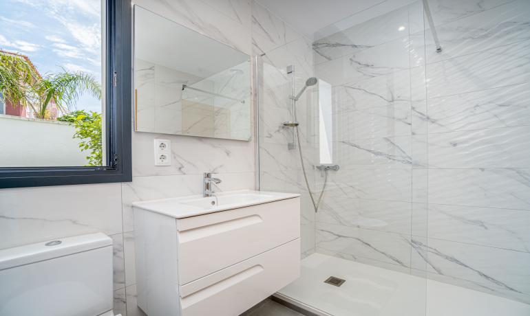 La planta piso dispone de cuatro dormitorios, incluido una suite con baño y un baño adicional. Cada dormitorio se abre a un gran balcón con vistas a la piscina. Esta villa también tiene un garaje cerrado.
