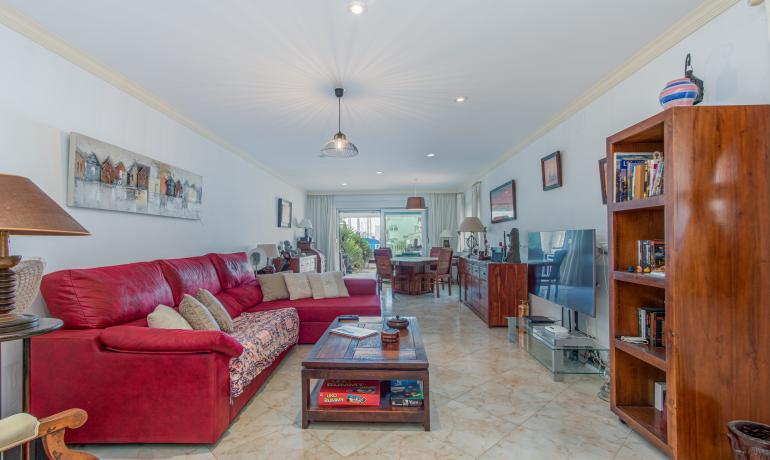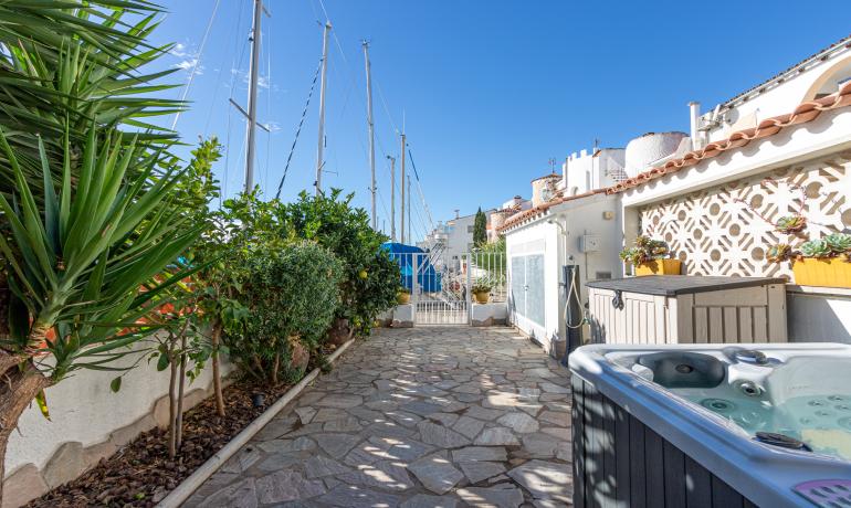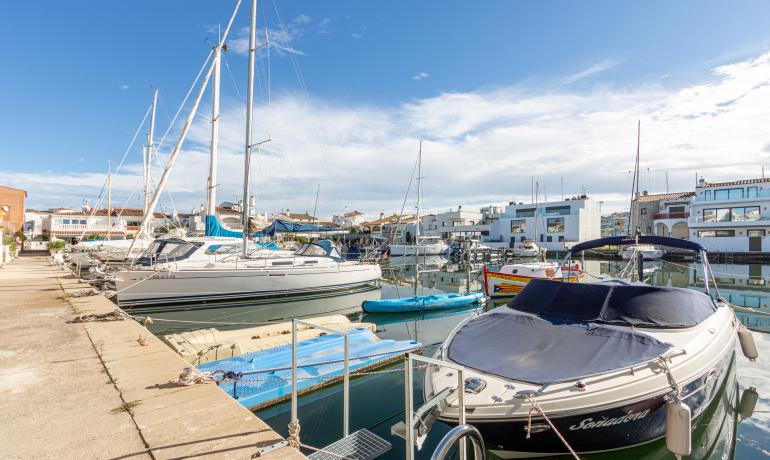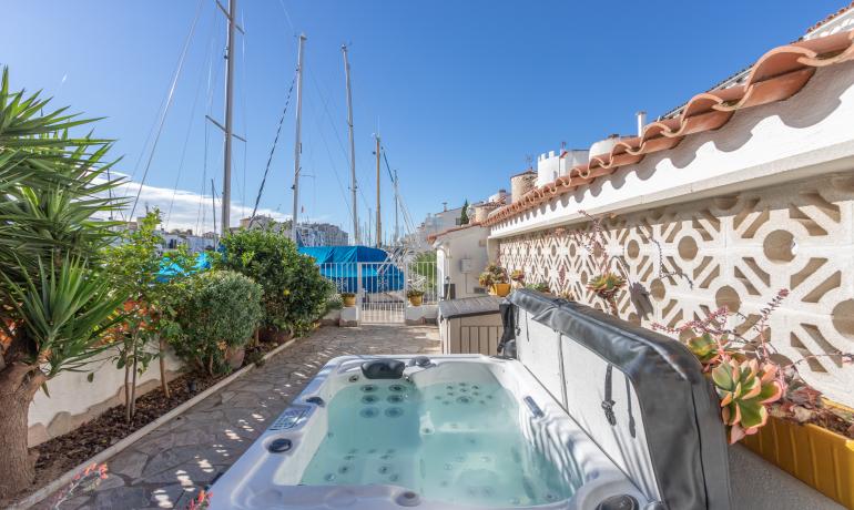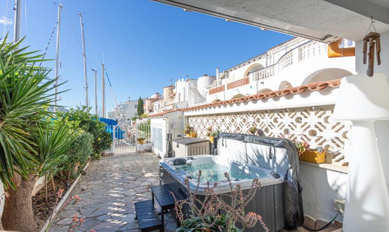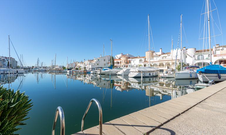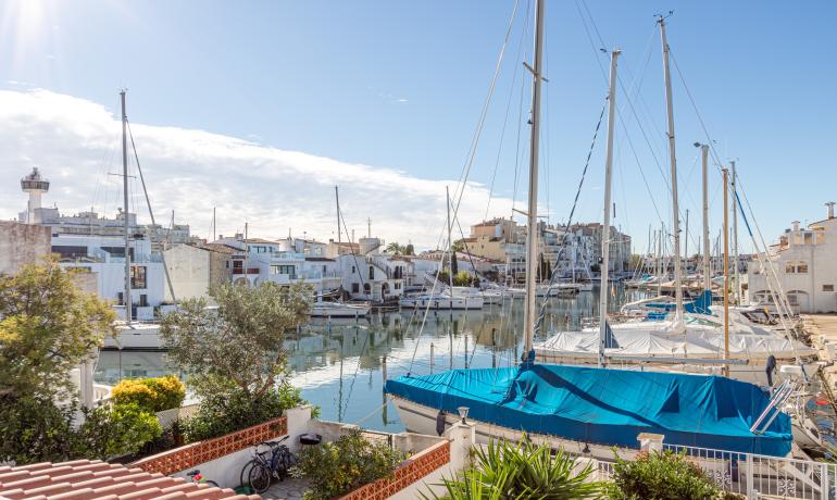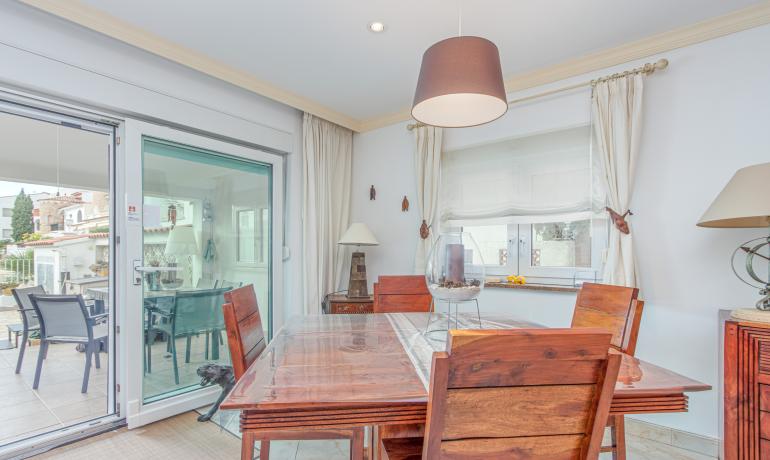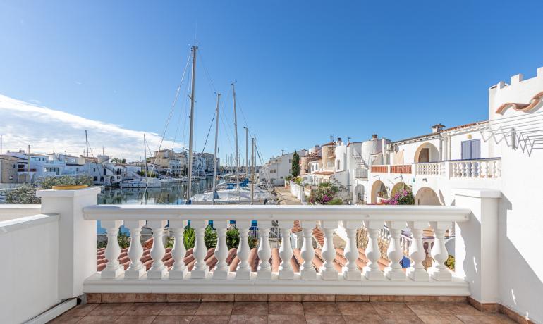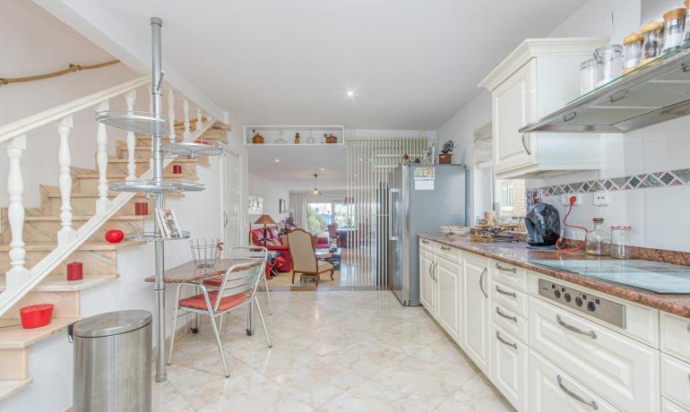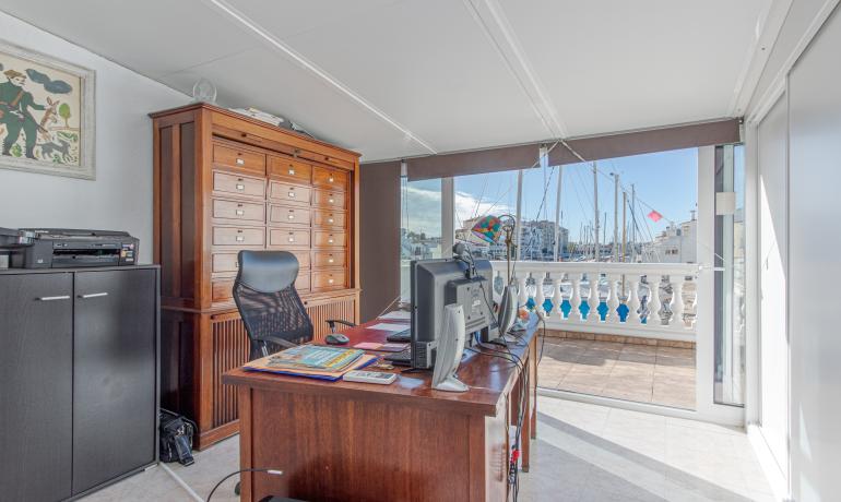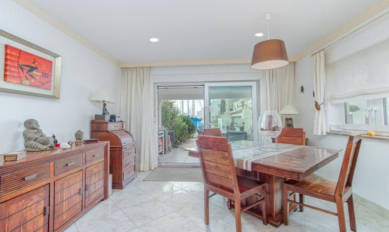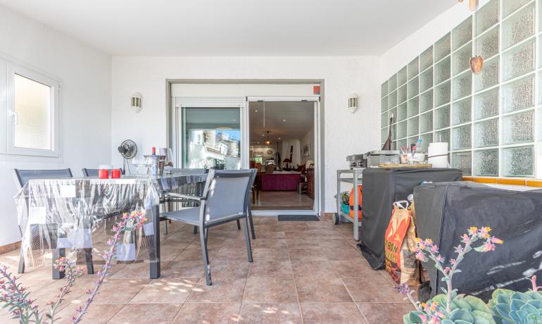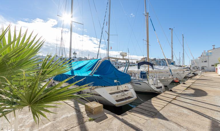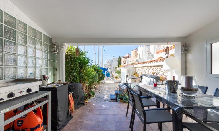 La casa se distribuye en un salón -comedor y cocina abierta con acceso a la terraza ( una parte de la terraza es cubierta ) orientada hacia sur-oeste y con vistas al puerto. Desde aquí también se accede al amarre de 12x4m.