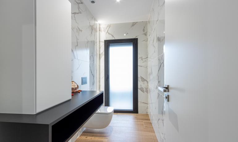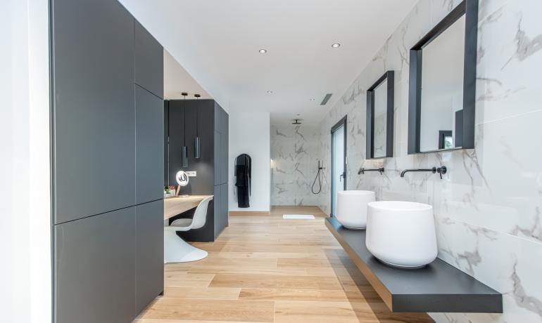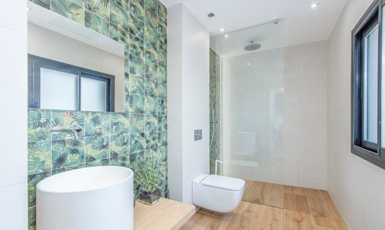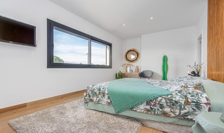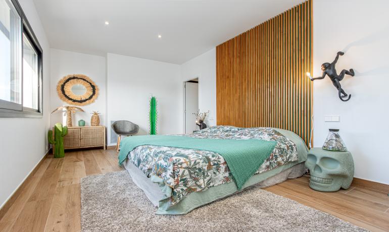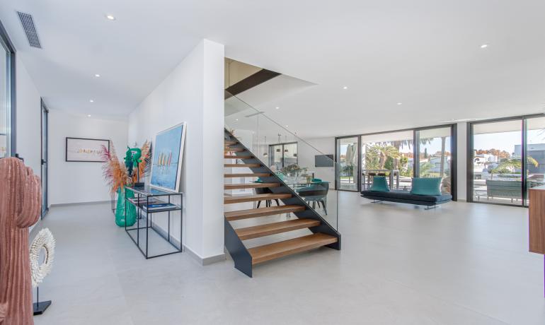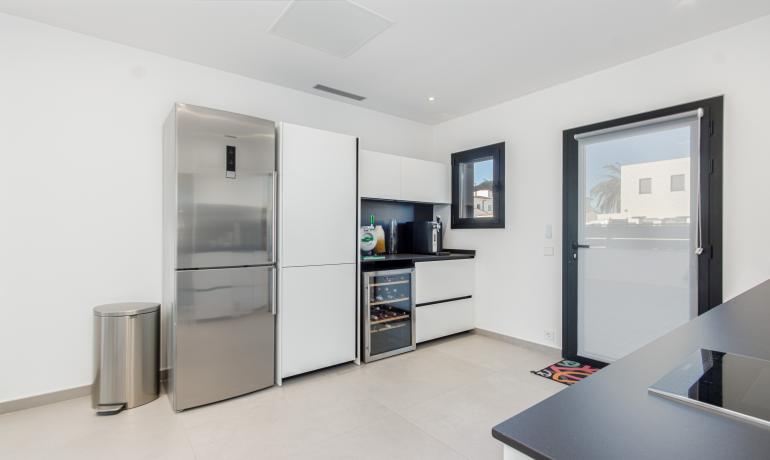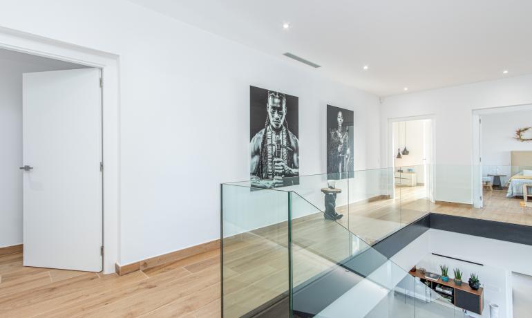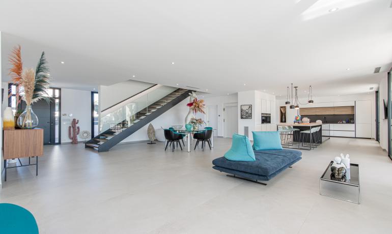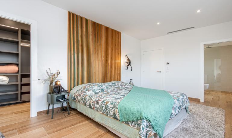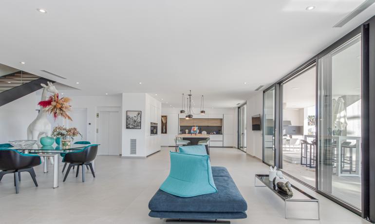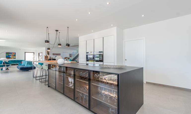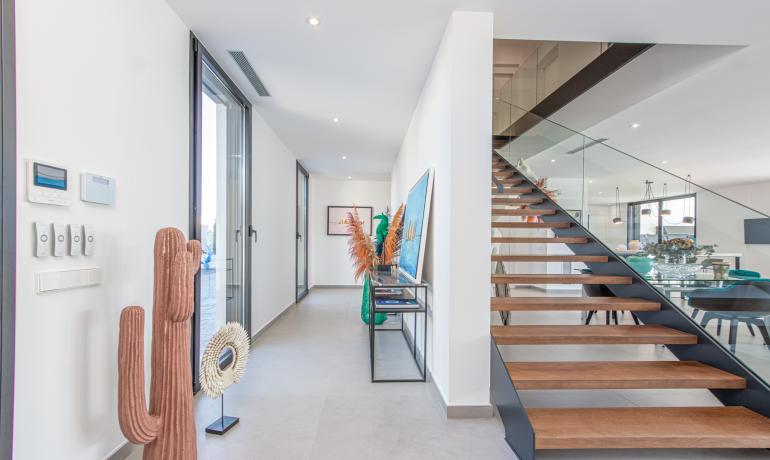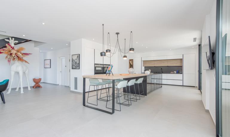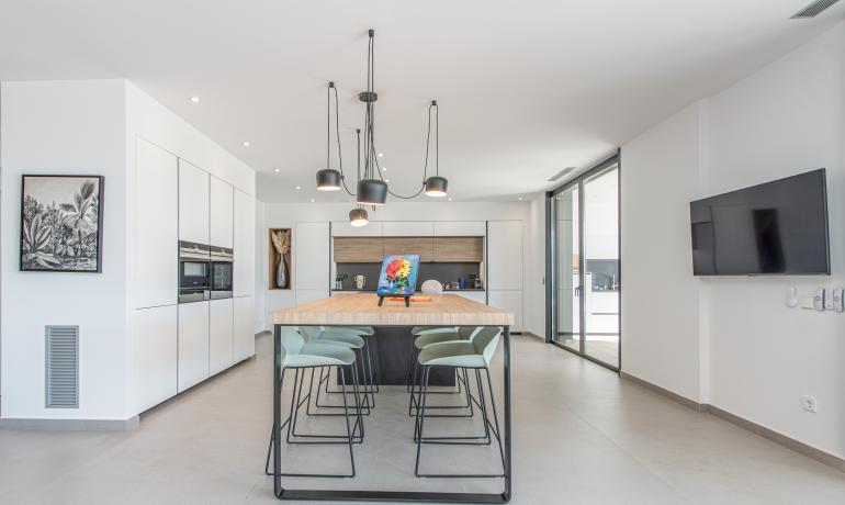 La casa se distribuye en planta baja y planta piso, ofreciendo en todos sus detalles la máxima calidad. En planta baja encontramos un impresionante salón comedor con chimenea y cocina abierta con salida a la terraza exterior y la piscina, además de un dormitorio en suite y una segunda cocina con lavadero y con acceso al amplio garaje, y un wc de inviados.