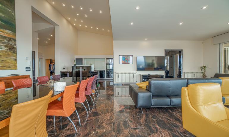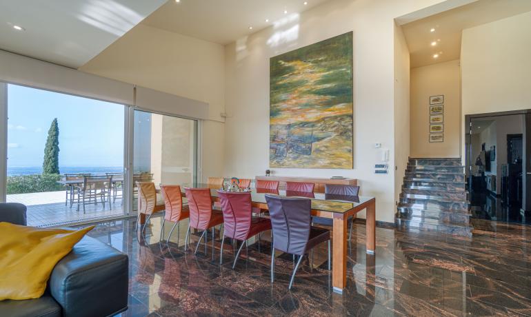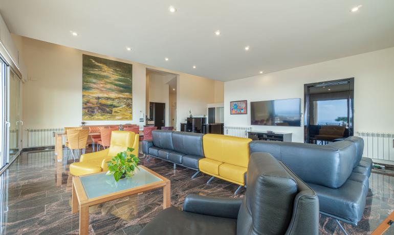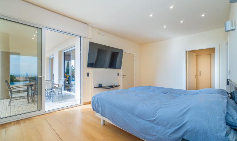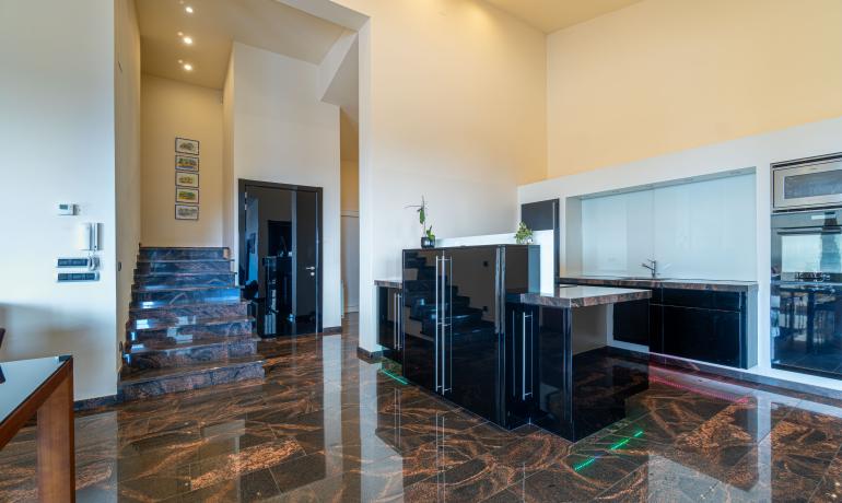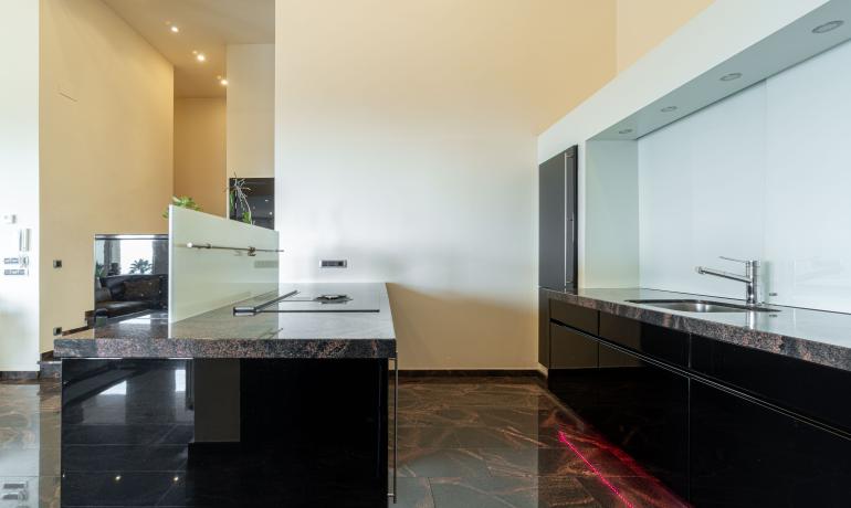 Desde el garaje o la entrada principal se accede a un amplio hall que conecta con la cocina abierta y el salón de techos altos con grandes ventanales que se abren hacia la terraza y la piscina. En esta planta se encuentra también una suite principal muy espaciosa con vestidor y baño completo (bañera, ducha y acceso directo desde la zona de piscina).