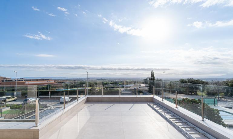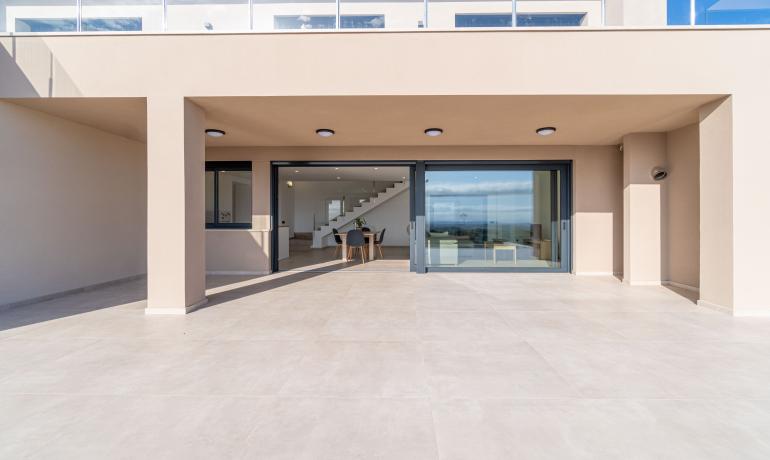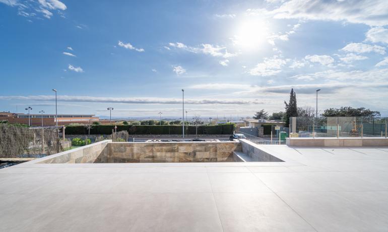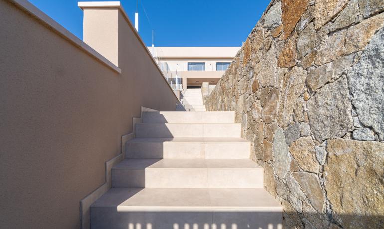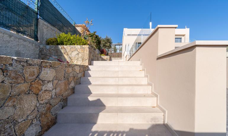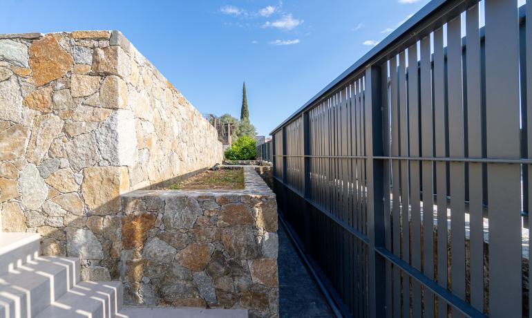 La planta baja le ofrece un diáfano salón – comedor y cocina americana, además de un dormitorio con baño en suite y vestidor. Desde este espacio tenemos acceso a la terraza posterior de la finca, con muros de contención decorados con piedra natural. También se accede a la terraza frontal principal, con una preinstalación para la barbacoa en la parte de la terraza cubierta (22m), y al resto de la terraza que da acceso a la piscina estilo infinity de 6.5m x 4m con vistas despejadas.