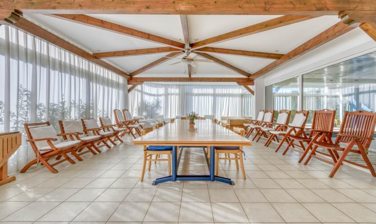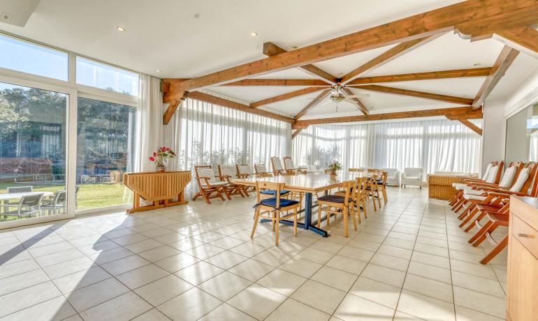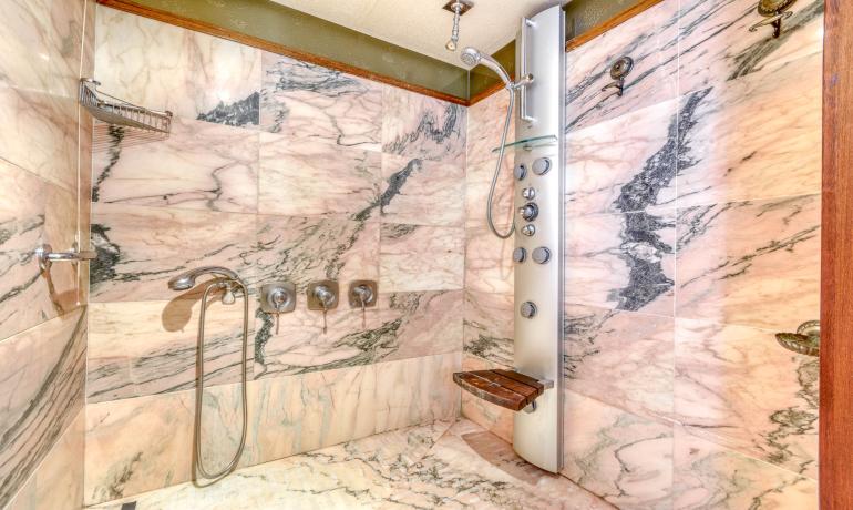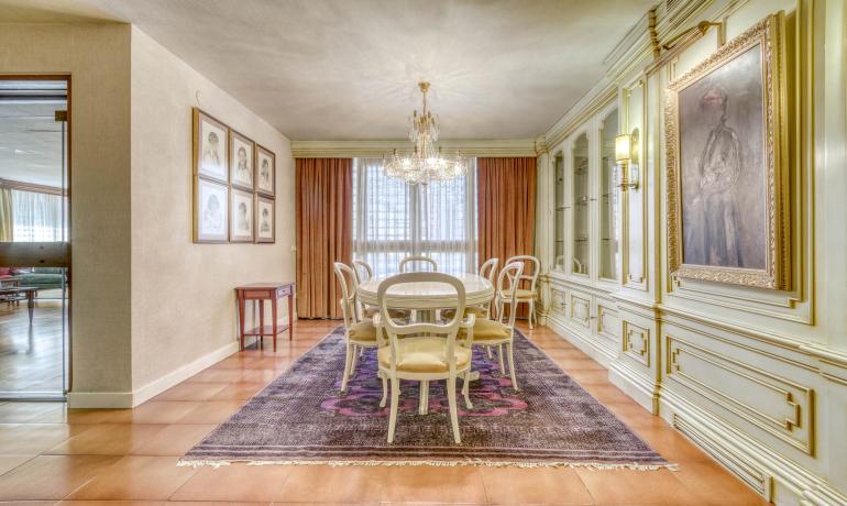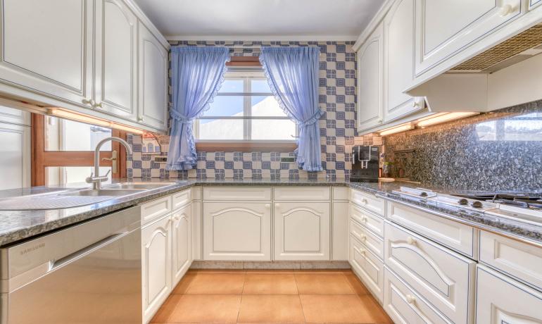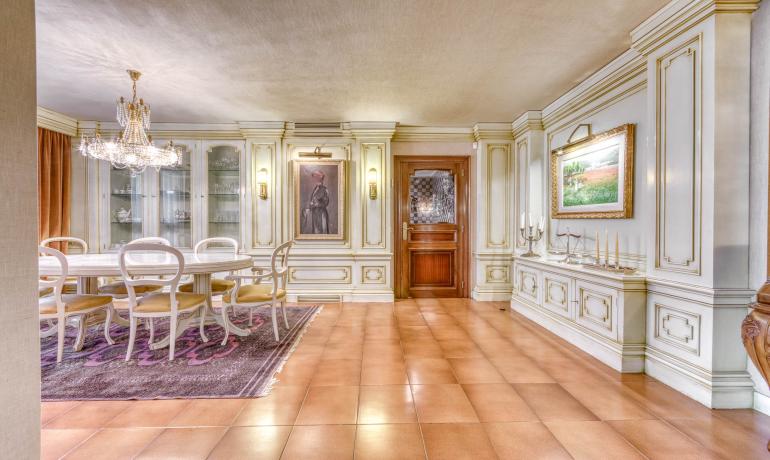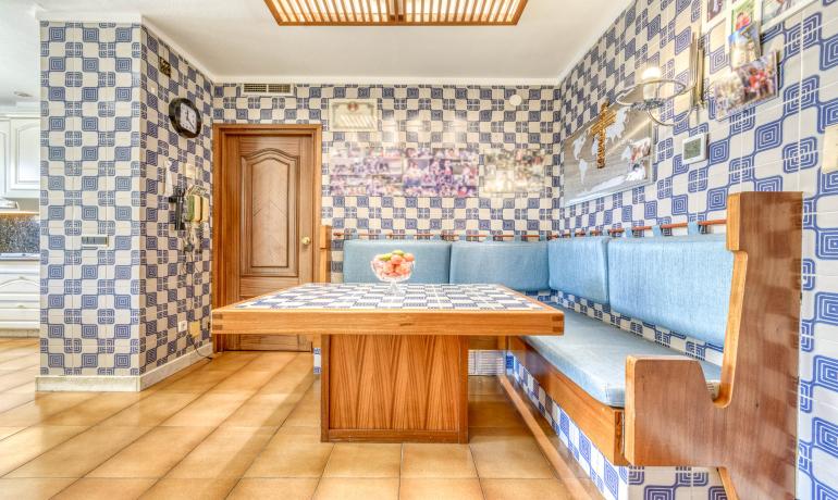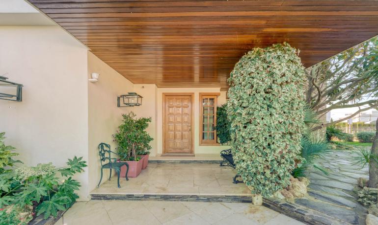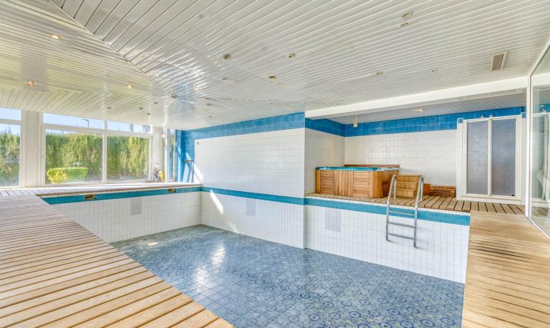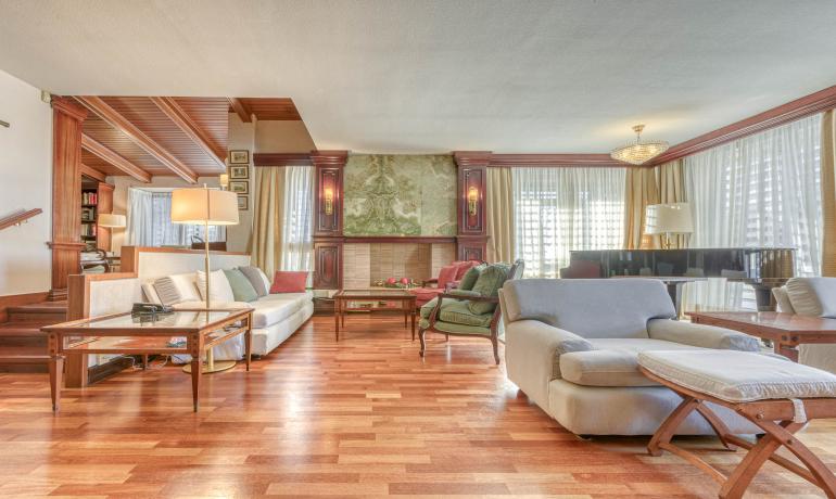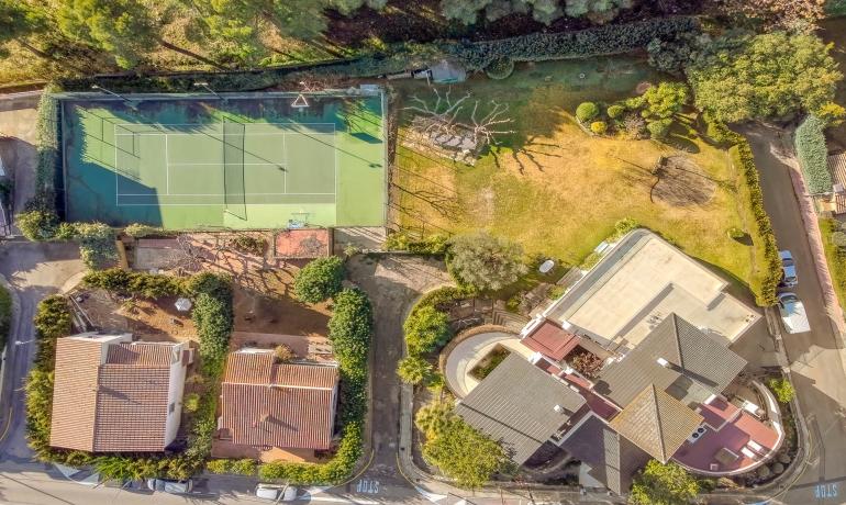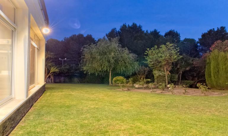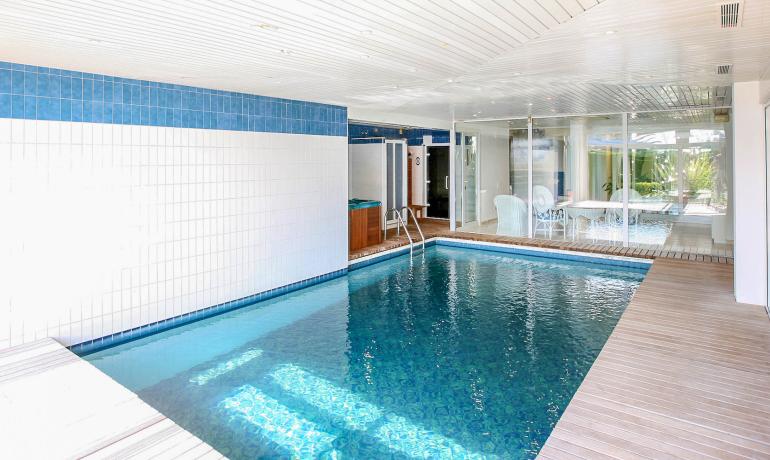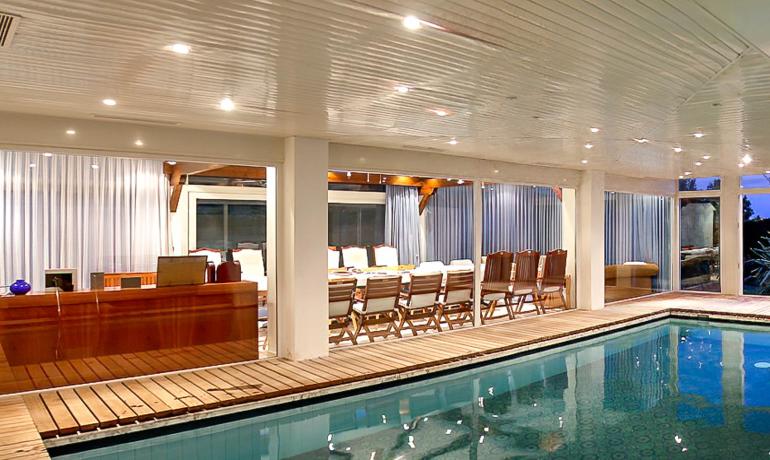 En la planta inferior tenemos el acceso al con piscina cubierta climatizada (purificada con cloro), con bordes de mármol recubiertos de tarima de madera; área de sauna, jacuzzi y ducha; un amplísimo comedor con ventanales de suelo a techo que dan al jardín, perfecto para las comidas con invitados y las celebraciones; una completa cocina de verano.