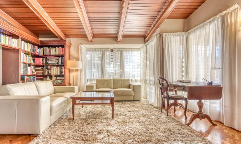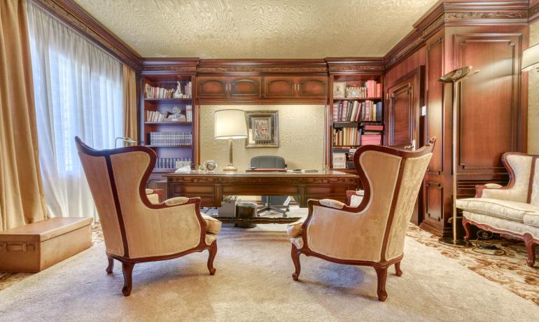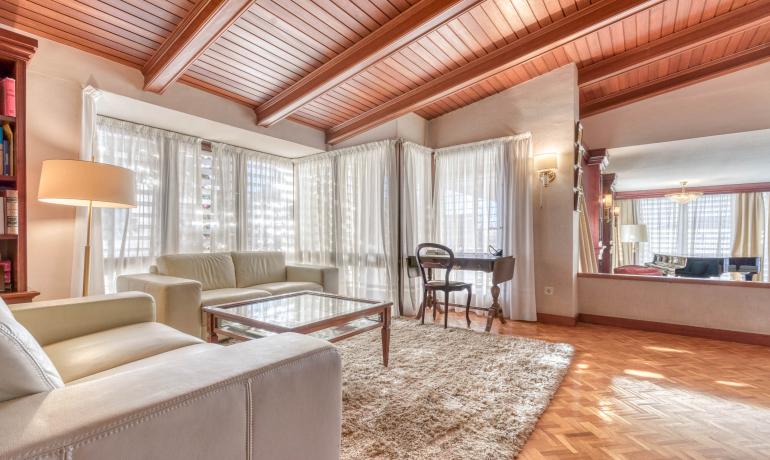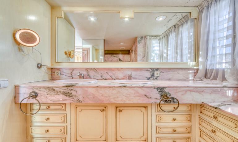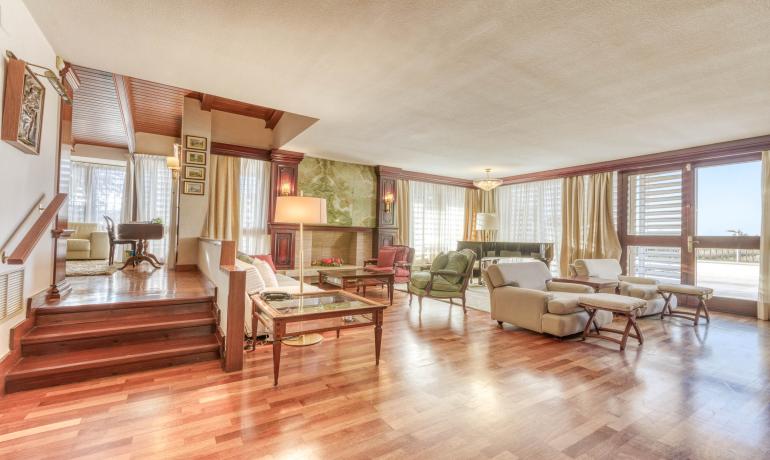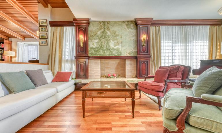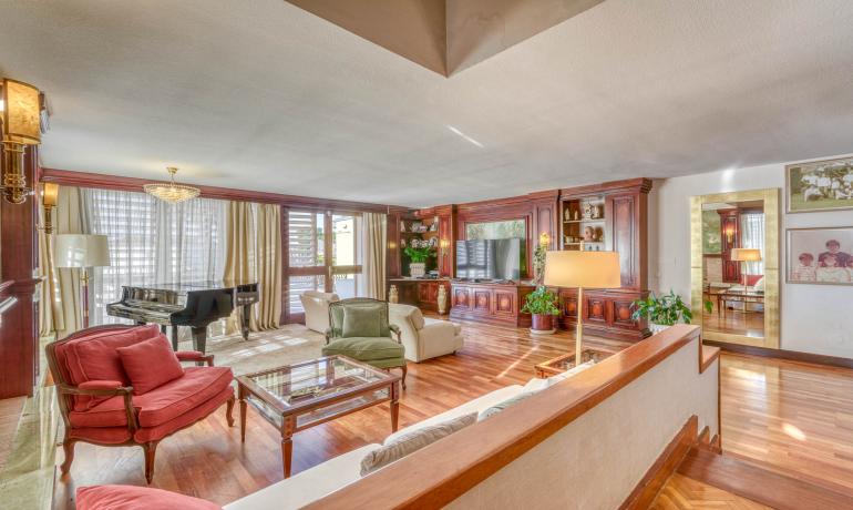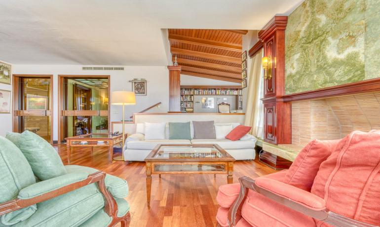 Gran y luminoso salón con chimenea de ónix que se abre a una amplísima terraza-solarium de más de 100m2. Techo abuhardillado y vigas de madera, cocina de estilo tradicional, despacho, magníficamente decorado con paredes revestidas de madera, y un aseo para las visitas. En la planta superior tenemos una elegante y acogedora suite principal con un lujoso baño decorado en mármol rosa y acceso a una terraza-mirador semicircular bordeando un patio de luces de estilo cordobés. Otro dormitorio en suite, también con ducha y acceso a la terraza, y un tercer dormitorio en suite, con bañera y ventanal a la terraza, aunque sin acceso directo a la misma. Todas las habitaciones de la casa cuentan con armarios empotrados. Esta planta cuenta también con un despacho.