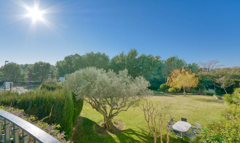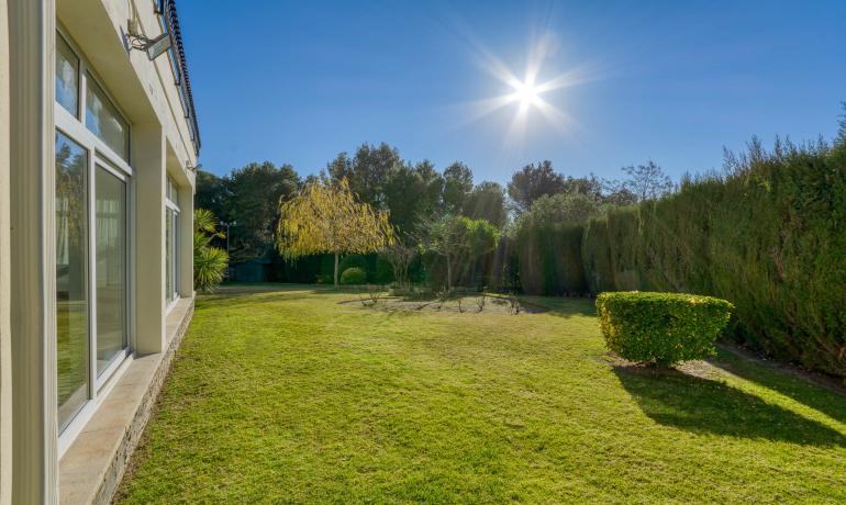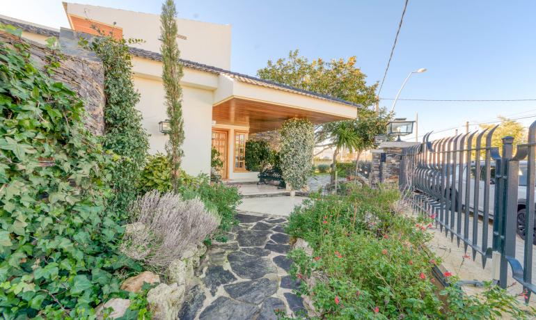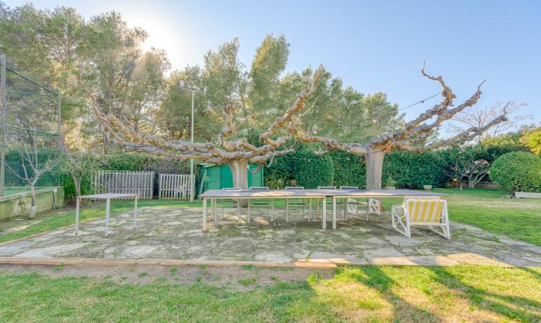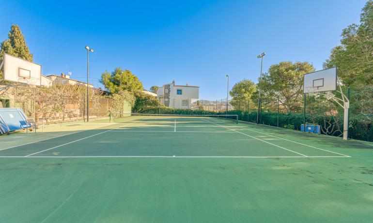 Jardín con sauces, olivos, arboles frutales, rosales…. Pista de tenis, canastas de baloncesto, barbacoa adosada a la fachada de ladrillo con techo de tejas, lavabo y armario auxiliar. En el jardín también hay una perrera y una caseta de madera para herramientas.