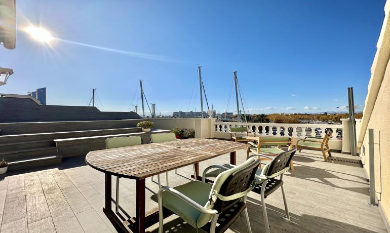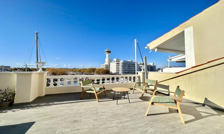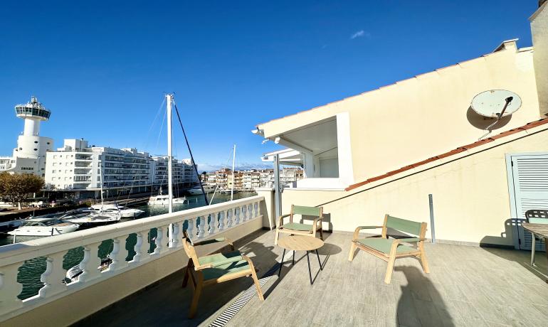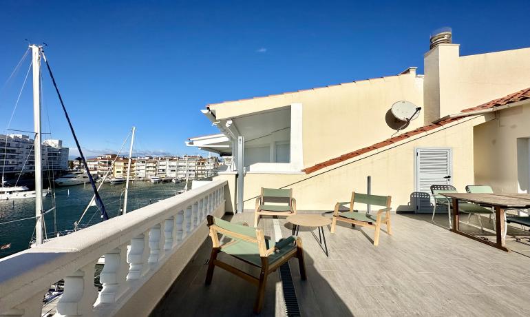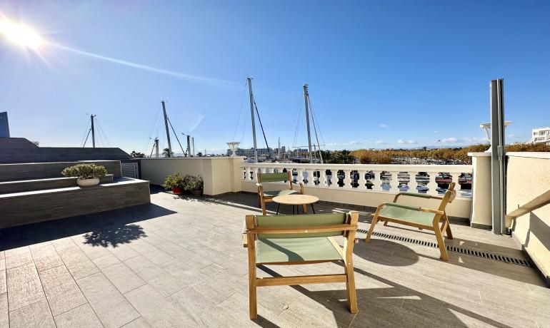Desde el salón, se accede a una magnífica terraza de 60 m², perfecta para relajarse, con una piscina privada y unas vistas impresionantes de los canales y el mar.