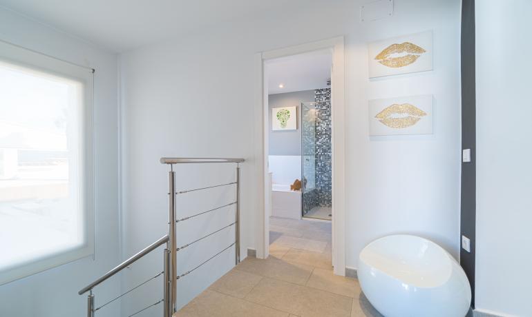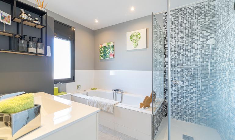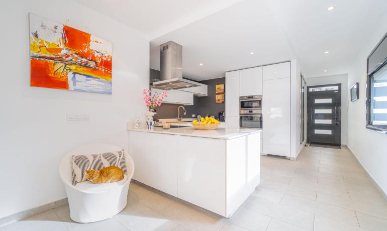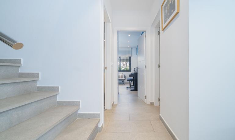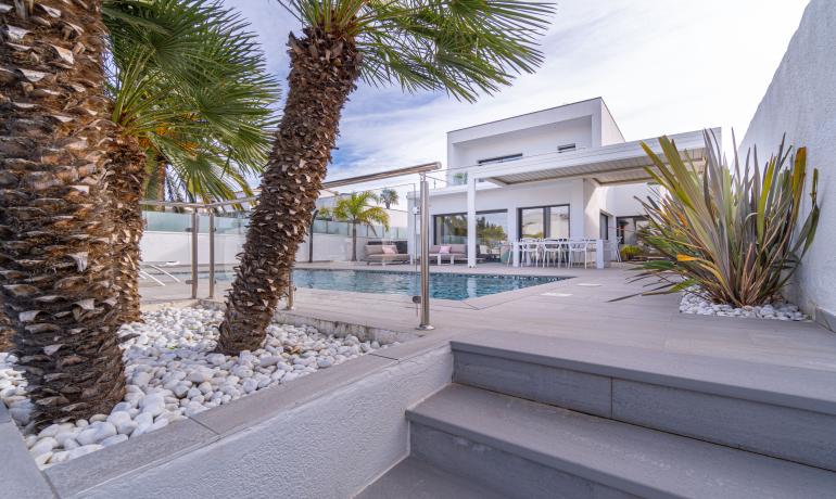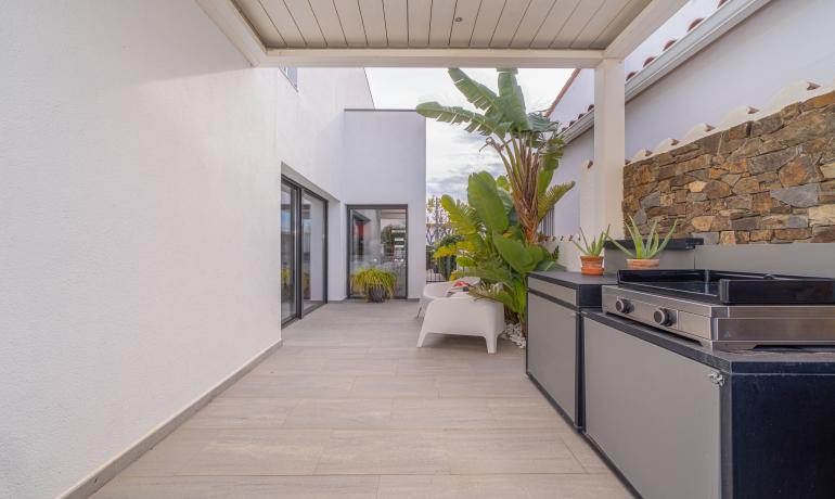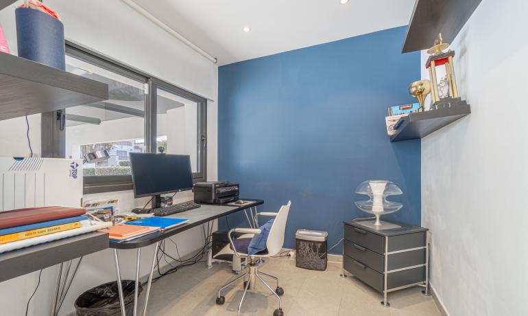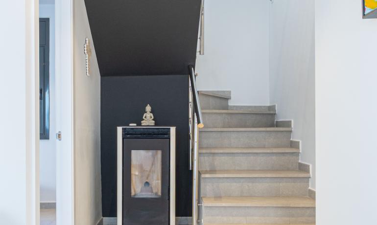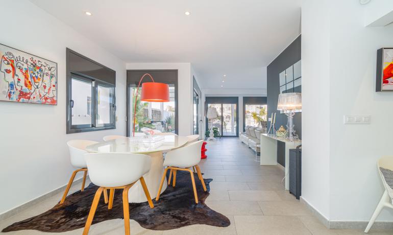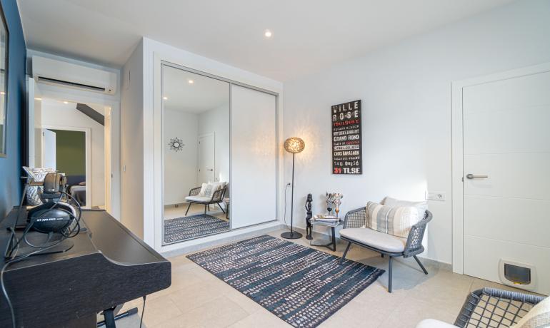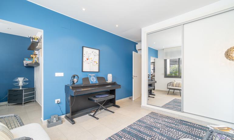 Le rez-de-chaussée se compose d'un hall d'entrée avec armoires encastrées, d'une cuisine ouverte équipée d'électroménager haut de gamme, d'une salle à manger et d'un vaste salon. De là, on accède à une élégante terrasse équipée de mobilier extérieur, d'une pergola bioclimatique avec éclairage, d 'un store électrique doté d'un capteur de vent et de pluie et d'un jacuzzi. La piscine au sel dispose d'un système de chauffage.