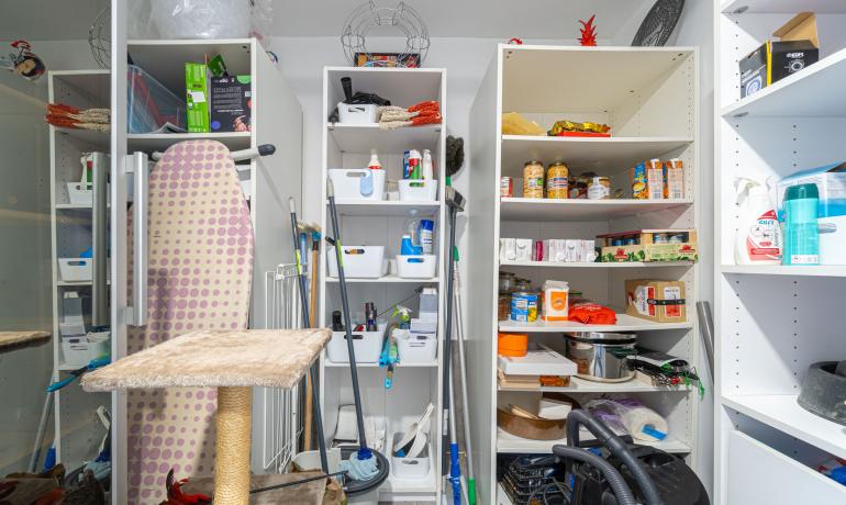 Le garage fermé a une capacité pour une voiture, ainsi qu'une zone de stockage et une chambre climatisée supplémentaire aménagée dans ce même espace.