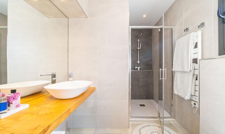 A l’étage se trouve la suite principale avec un beau dressing et une salle d'eau complète. Cette suite bénéficie d'une grande terrasse privée avec vue sur le canal. A ce niveau se trouve également une autre chambre double, très spacieuse et une salle de bain complète.