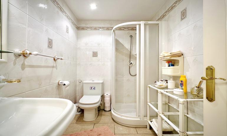 Deuxième étage : couloir, grande salle de bains et grande chambre avec terrasse privée.