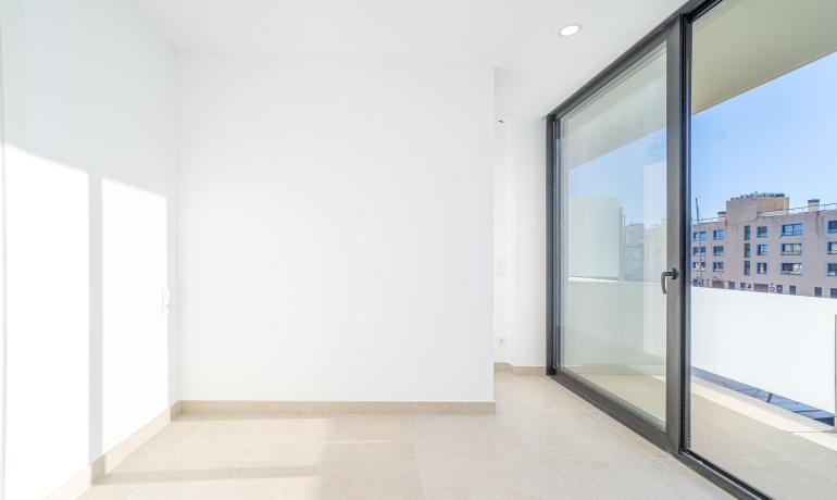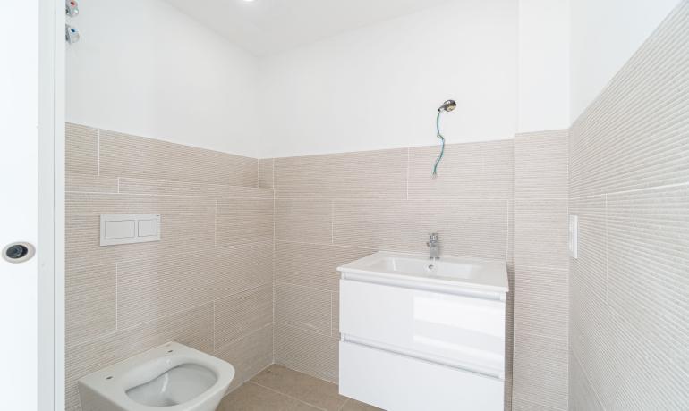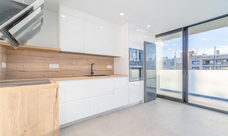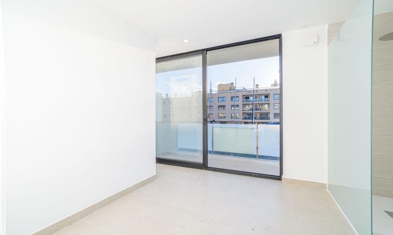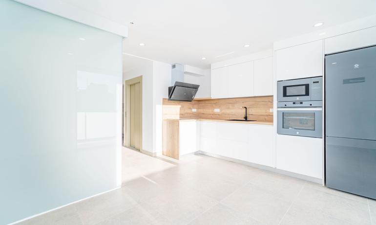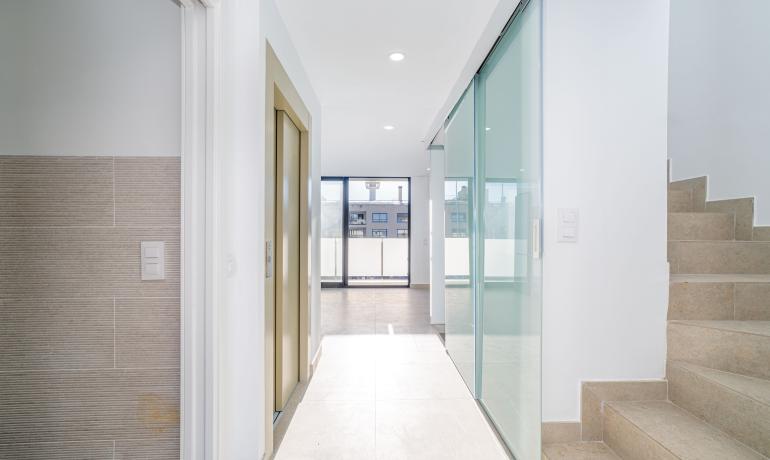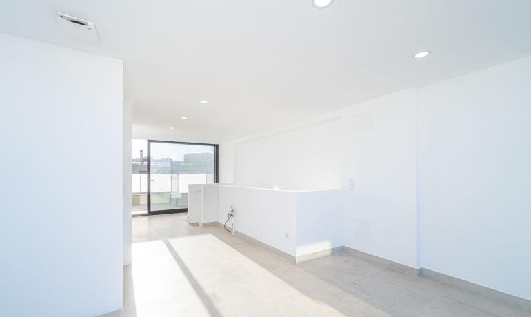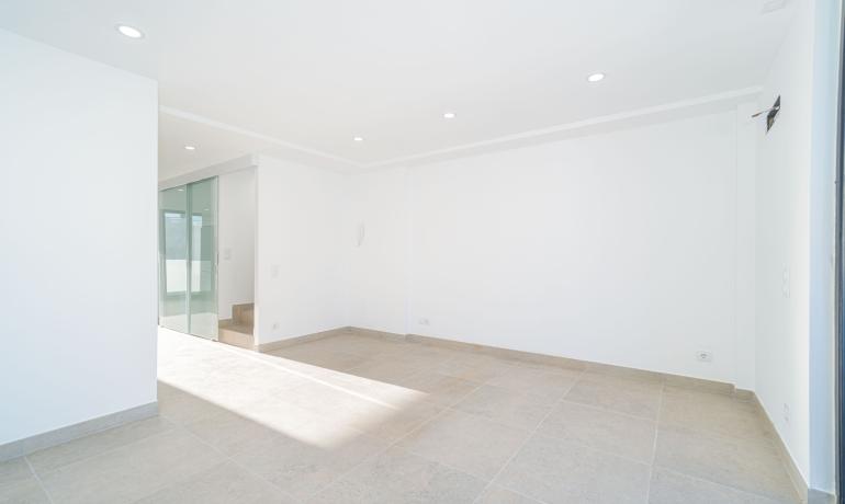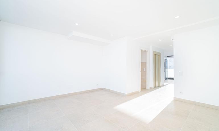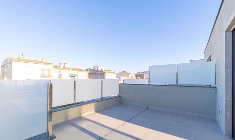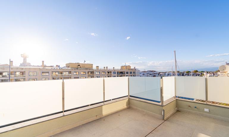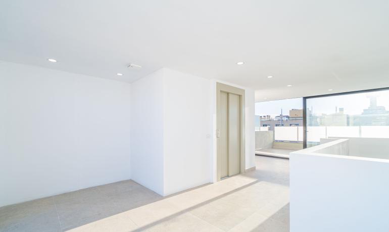 La propriété s’étend sur trois niveaux et comprend un solarium de 48 m² sur le toit, un garage privé et un ascenseur. À l’intérieur, elle offre trois chambres doubles, deux salles de bains complètes et un toilette supplémentaire, ainsi qu’une terrasse et un balcon avec une belle vue.