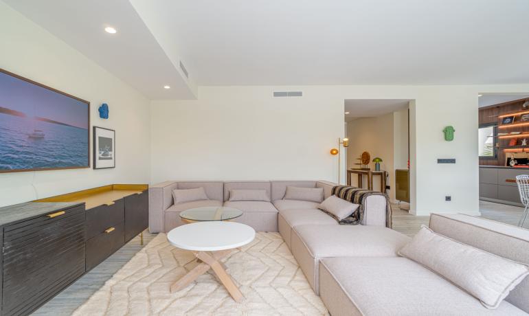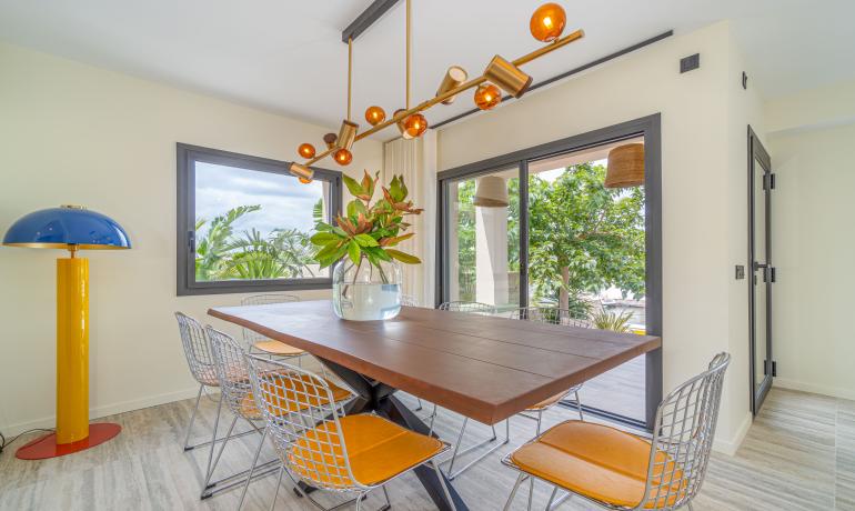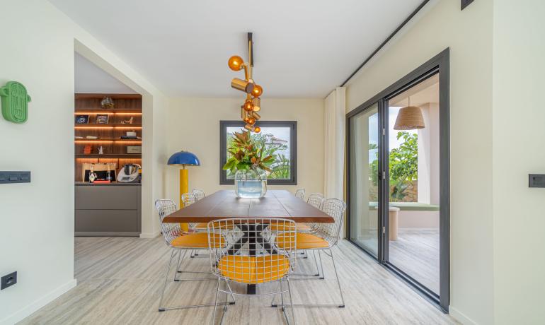 Depuis le salon, on accède directement à la terrasse, au jardin extérieur et à la piscine.