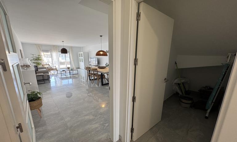 La maison est répartie sur trois niveaux. Au rez-de-chaussée, on trouve une cuisine fonctionnelle, une salle de bain complète, un débarras pratique et un spacieux salon-salle à manger avec accès direct à une terrasse privée. De là, on accède à l’amarrage de 8 mètres, idéal pour profiter de la navigation depuis chez soi.