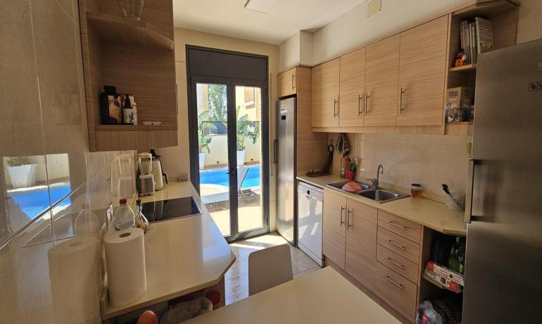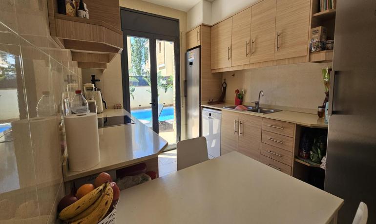La cuisine et le salon-salle à manger donnent accès à la piscine. Depuis la cuisine, on accède également au garage et à la buanderie.