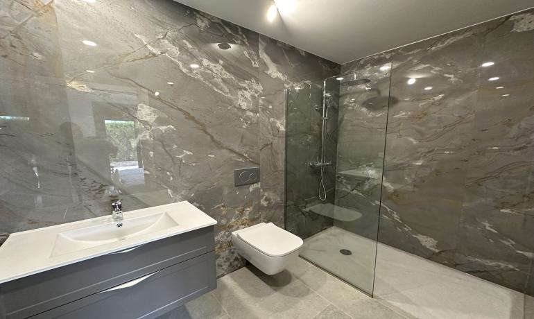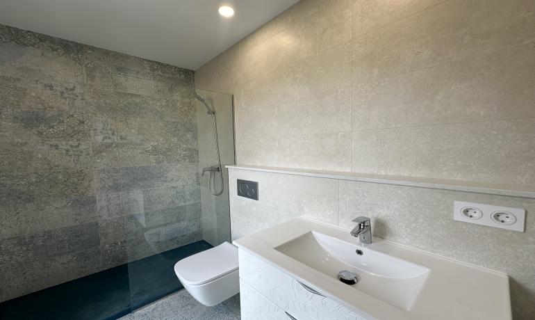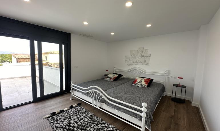 Un bel escalier en bois vous relie au premier étage avec trois grandes chambres et deux terrasses de chaque côté. La suite parentale est magnifiquement décorée et dispose également d'une salle de bains avec douche à l'italienne.