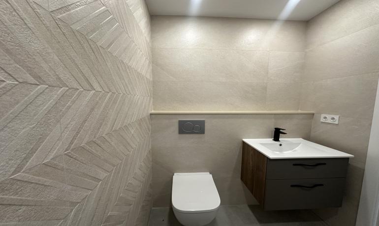 Sa terrasse et sa piscine sont orientées sud-ouest, ce qui permet de profiter du soleil tout au long de l'année. Le rez-de-chaussée se compose d'un salon spacieux avec salle à manger et d'une cuisine ouverte. L'espace de vie total de 62m2 est entouré de grandes fenêtres offrant beaucoup de lumière à l'intérieur. De plus, il y a des toilettes pour les invités, une chambre spacieuse avec des armoires et une salle de bain avec une douche à l'italienne.